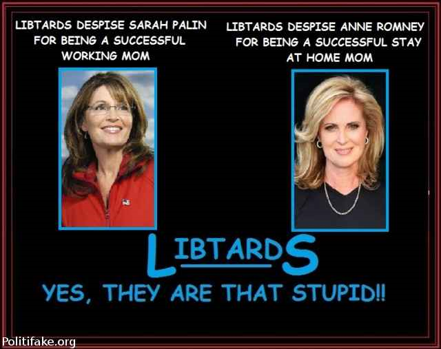 I don’t know of any “libtard” who despises Sarah Palin simply for being a working mom , or Anne Romney for being a stay at home mom. Do these fools really think liberals are that superficial?