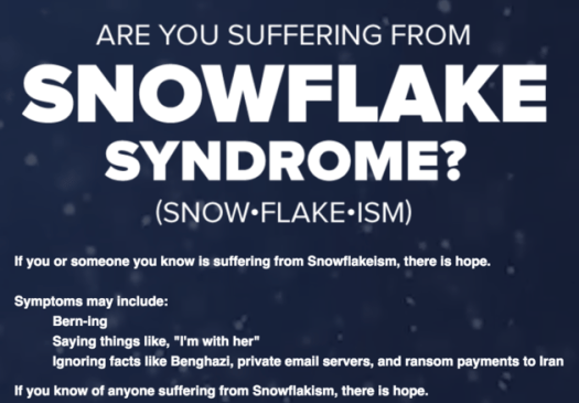 If you answered yes to any of these questions , then you are definitely a butt hurt , misty eyed crybaby snowflake. Symptoms definitely include repeating phrases like ‘Trump won the popular vote.’ ‘Millions of illegals voted in the election.’ ‘Voter fraud is rampant.’ ‘Democrats are the party of racism.’ ‘Obama is a Muslim.’ ‘Obama hates America.’ ‘Obama hates cops.’ ‘Black Lives Lives Matter is the new KKK , a terrorist hate group.’ ‘CNN , MSNBC and the liberal mainstream media are fake news , but Fox News and Tomi Lahren tell it like it is!’ Ignoring the investigative reports and screaming ‘Benghazi! Benghazi! Benghazi!’