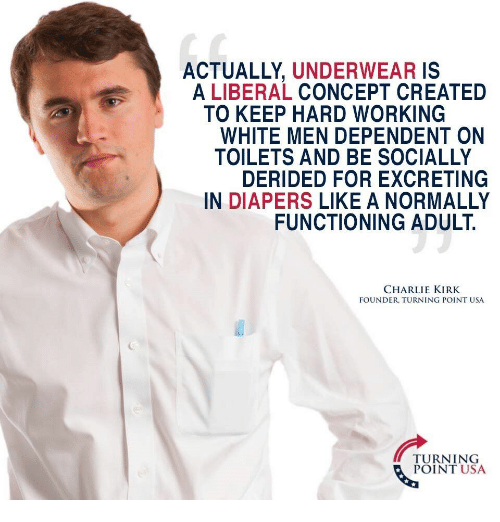 Kirk owned the libs in spectacular fashion at last year’s Politicon event when his pants fell down during a heated debate with the Young Turk’s Hasan Piker , revealing his favorite choice of diapers – Pampers.
