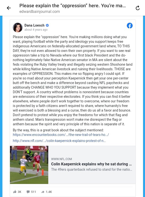 Since 2016, Kaepernick has donated over a million dollars to various causes and his time to various community charities, but conservatives couldn’t care less. All they care about is trashing him to make themselves feel morally superior. Has Loesch donated her time or millions to charity? Not a chance. I guarantee it.