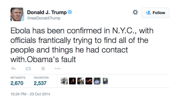 Trump’s reaction to Ebola was nonstop tweeting about how irresponsible and incompetent Obama was.