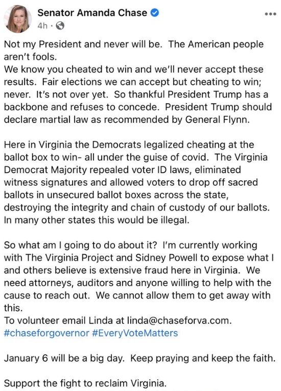 Virginia GOP state Senator Amanda Chase threw a tantrum on her Facebook page after the EC confirmed Sleepy Joe’s election victory, calling for Trump to suspend the Constitution and declare martial law so he could steal a fair election.