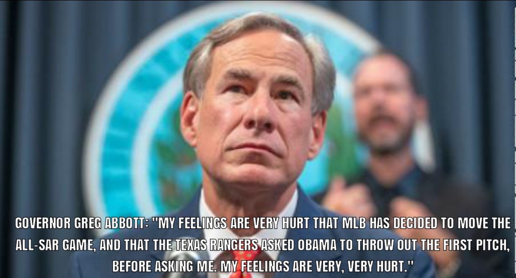 In an additional statement, Governor Abbott said he would never ever again “participate in any events sponsored by Major League Baseball, and neither will Texas seek to host a future All-Star game, or any other MLB sponsored event,” because his feelings were “very, very hurt and insulted that Major League Baseball had decided to move the All-Star game, and that the Texas Rangers had the audacity to ask former president Obama to throw out the season’s first pitch.”