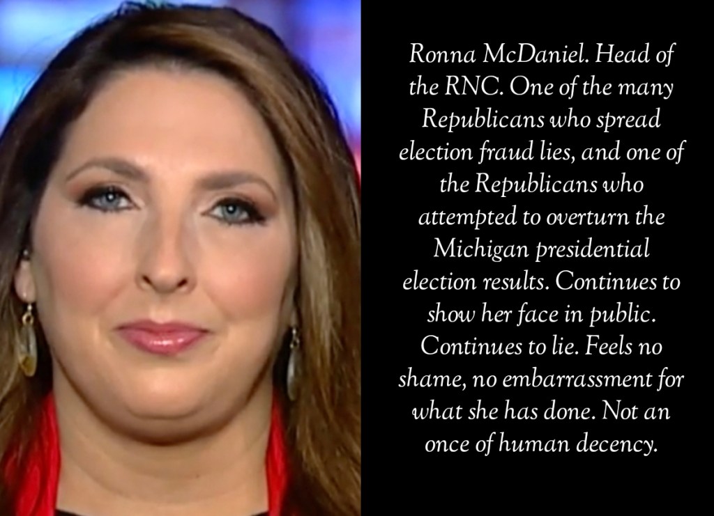 Ronna McDaniel has no right to criticize Joe Biden for his withdrawing from Afghanistan and the deaths of American soldiers, when she has shamelessly defended and made excuses for Trump’s pathetic handling of the pandemic, a president who failed to lead the American people by example, by convincing them that wearing a mask was the right thing to do, that listening to the experts was the right thing to do. He failed in his responsibilities to lead the nation in a time of crisis, and he failed the American people by refusing to accept that he lost an election.